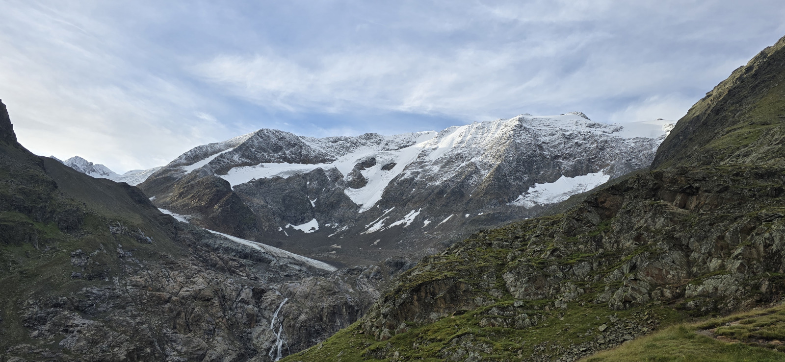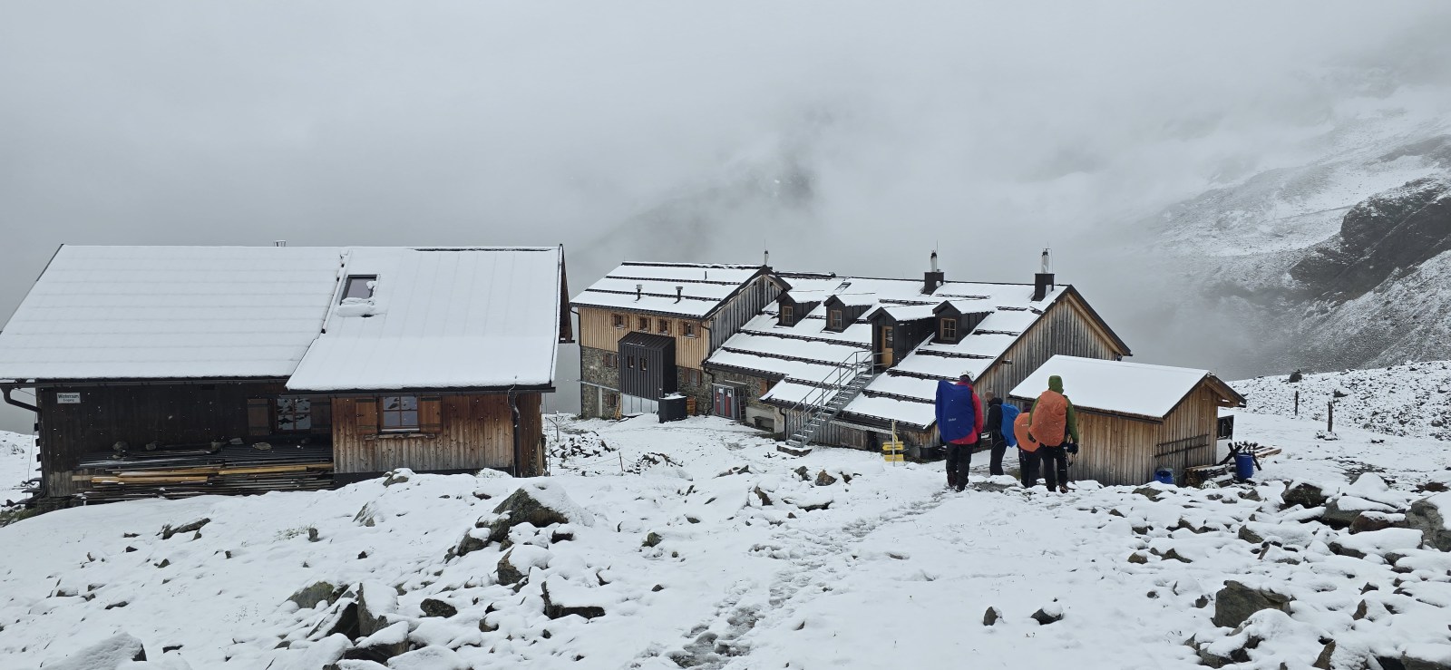 Tags darauf ging es im Regen weiter zur Kaunergrathütte (2.810 m hoch). Wir nahmen den Weg über das apere Madatschjoch, welches bis auf 3.030 m führt. Der Regen wechselte ab 2750 HM in Schnee und so war der Übergang einer Winterbegehung ähnlich. Alles weiß, keine Markierungen und kein Weg mehr zu sehen und technisch anspruchsvoll – wir waren froh, als wir endlich die Kaunergrathütte sahen und diese erreichten. Der Schneefall nahm im Laufe des Abends noch zu und am nächsten Tag waren die umliegenden 3000er ordentlich mit Schnee angezuckert.