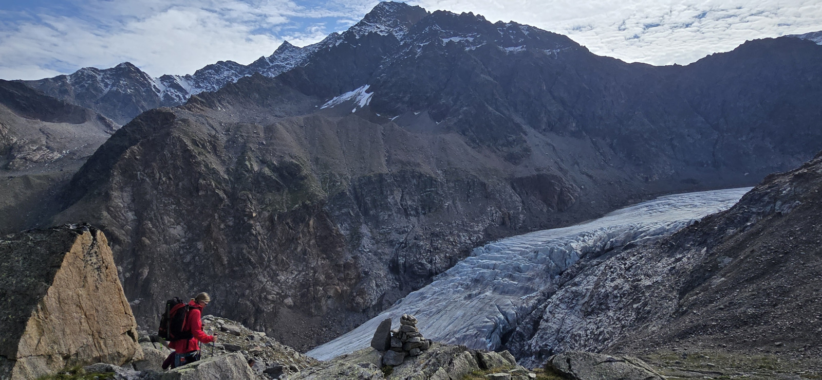 Wir begannen am Folgetag mit dem Aufstieg durch den Fernergarten und das Wannel zur Rauhekopfhütte auf 2800 m. Dazu muss die Gletscherzunge des Gepatschferners gequert werden. Der untere Teil von Tirols längstem Gletscher war blank und jede Spalte und jedes Loch gut sichtbar – ausgezeichnet für eine Wiederholung der Steigeisentechnik und für das Begehen von Gletschern. Unterhalt des riesigen Gletscherbruchs querten wir zur Seite und stiegen anschließend auf gutem Weg zur Rauhekopfhütte auf. Diese wird von ehrenamtlichen Hüttenwirten der Sektion Frankfurt bewirtet. Wir hatten das Vergnügen, vom Frankfurter Hüttenverantwortlichen Stefan, seinem Kumpel und den beiden Söhnen bewirtet zu werden. Wir können die Hütte und den Flair nur jedem empfehlen, die Lage der Hütte sucht ihresgleichen. Allerdings ist für den Aufstieg dringend Gletschererfahrung und sicheres Begehen von Gletschern notwendig.
