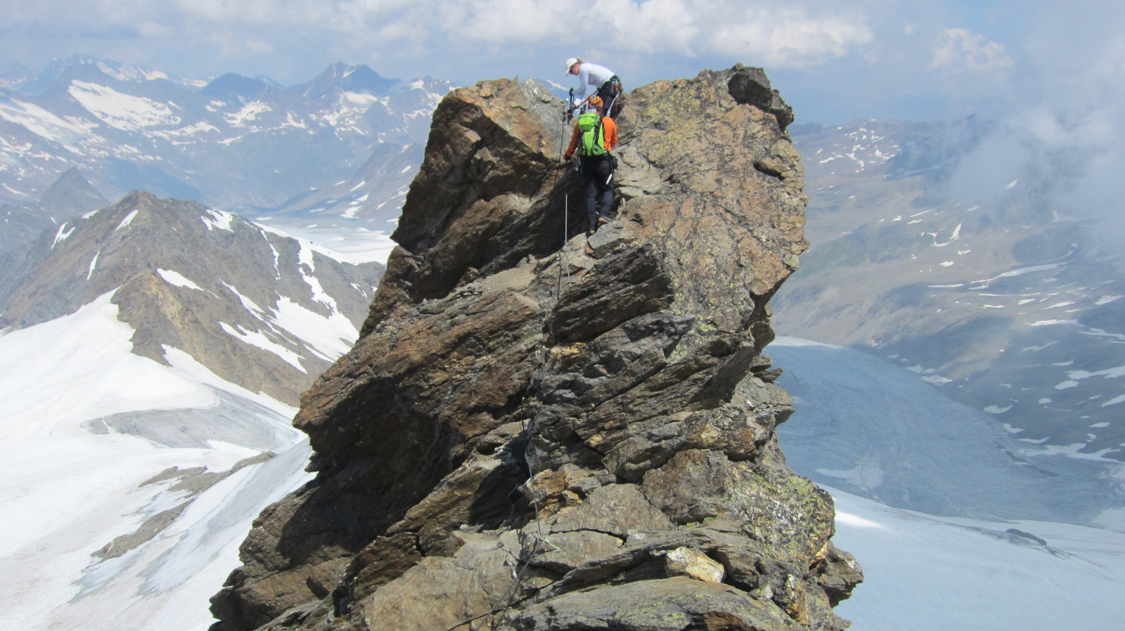 Das Eiskögele (3228 m) wird auf unserer Eingehtour schnee- und eisfrei bestiegen. Mit dem Hinteren Seelenkogel (3472 m) bietet sich eine einfache Hochtour mit Gletscherbegehung an. Weiterhin können wir am Schwärzenkamm einen knackigen Klettersteig (Kategorie C mit D-Stellen) mit grandiosen Tiefblicken erleben. Die Hohe Wilde (3461 m) soll der krönende Abschluss mit einer langen, aber technisch einfachen Kombination aus Wander- und Gletschertour mit Klettersteigelementen am Gipfelgrat sein, bevor wir zum Ramolhaus (3006 m) wechseln. Von dort bieten sich die Gratanstiege zum Spiegelkogel (3426 m) oder der nördliche Ramolkogel (3428 m) als lohnende Gipfelziele an. Zwischendurch können auf den Gipfeltouren je nach Möglichkeit und Gelände Ausbildungsinhalte zum sicheren eigenständigen Begehen von anspruchsvollen Berggipfeln vermittelt werden.
